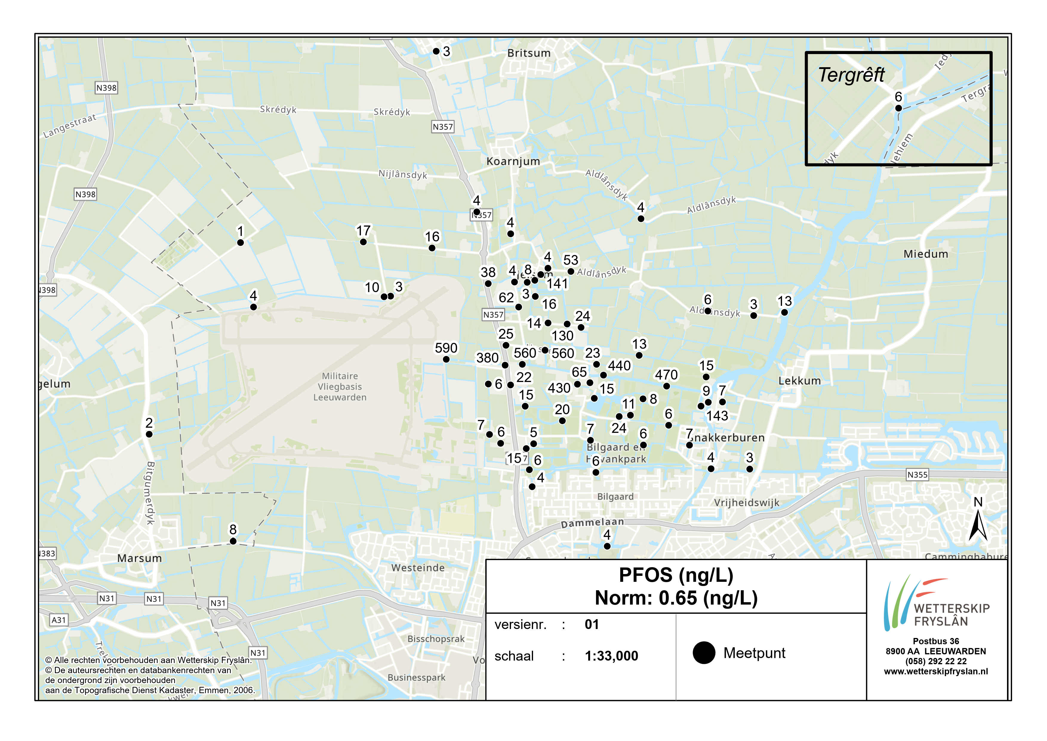 Op de kaart staat halverwege de Lytse Feart het meetpunt waar teveel PFOS is gemeten. Hier is de normoverschrijding bijna 200 keer de PFOS-norm (0,65 nanogram per liter), dus vergelijkbaar met de PFOS-gehalten in de Jelsumer Feart. Ter vergelijking: in de rest van het beheergebied van Wetterskip Fryslân meet het waterschap op 22 meetlocaties een gemiddelde PFOS-overschrijding tot ruim 3 keer de PFOS-norm.